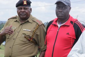 Bomet Central AP Commandant Stephen Musyoka conversing with APS Bomet Team Manager Geoffrey Bett shortly after addressing the Media in Bomet Stadium during the launching of the players’ trial.
