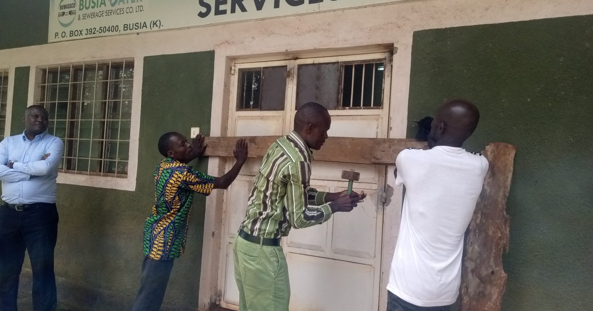The Busia Water and Sewerage Company workers have shut down their main office door as they protested over unpaid salary arrears.