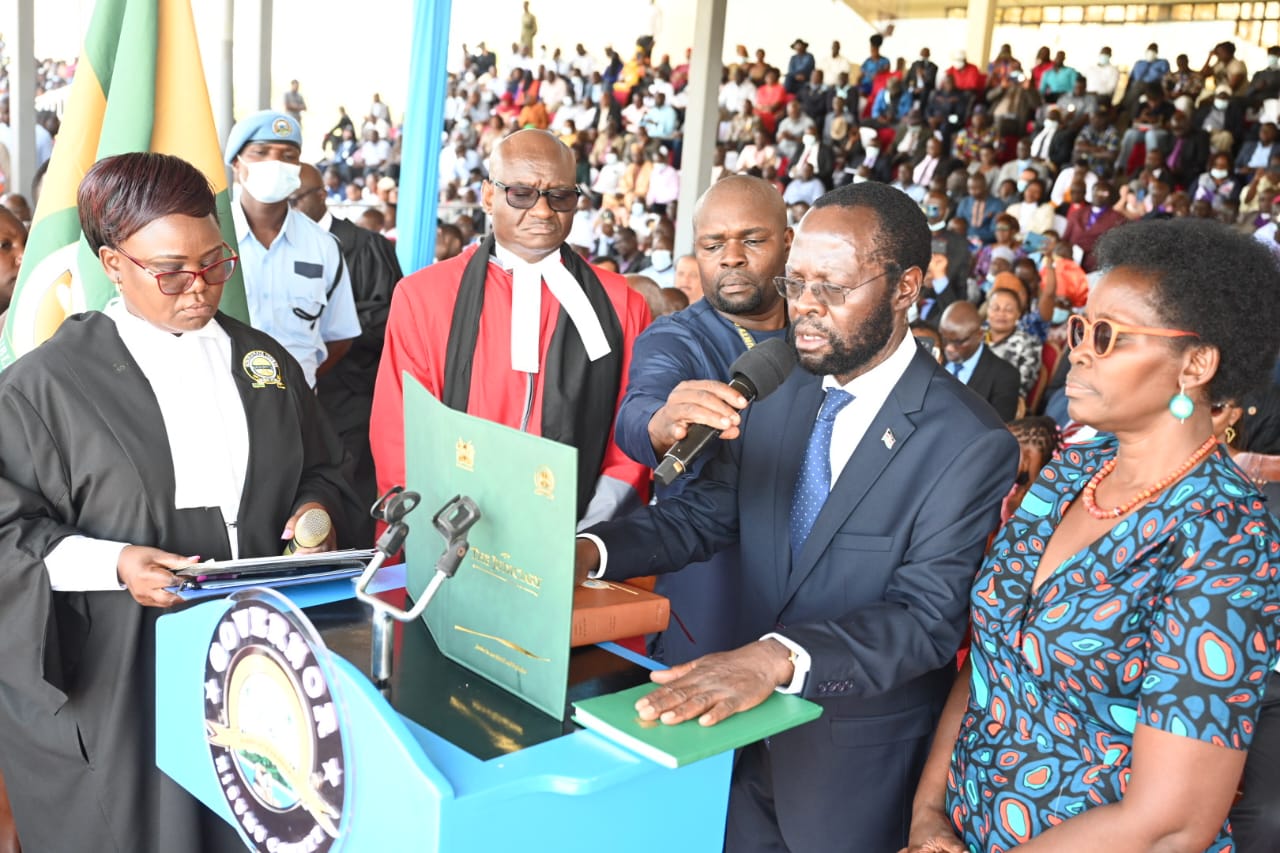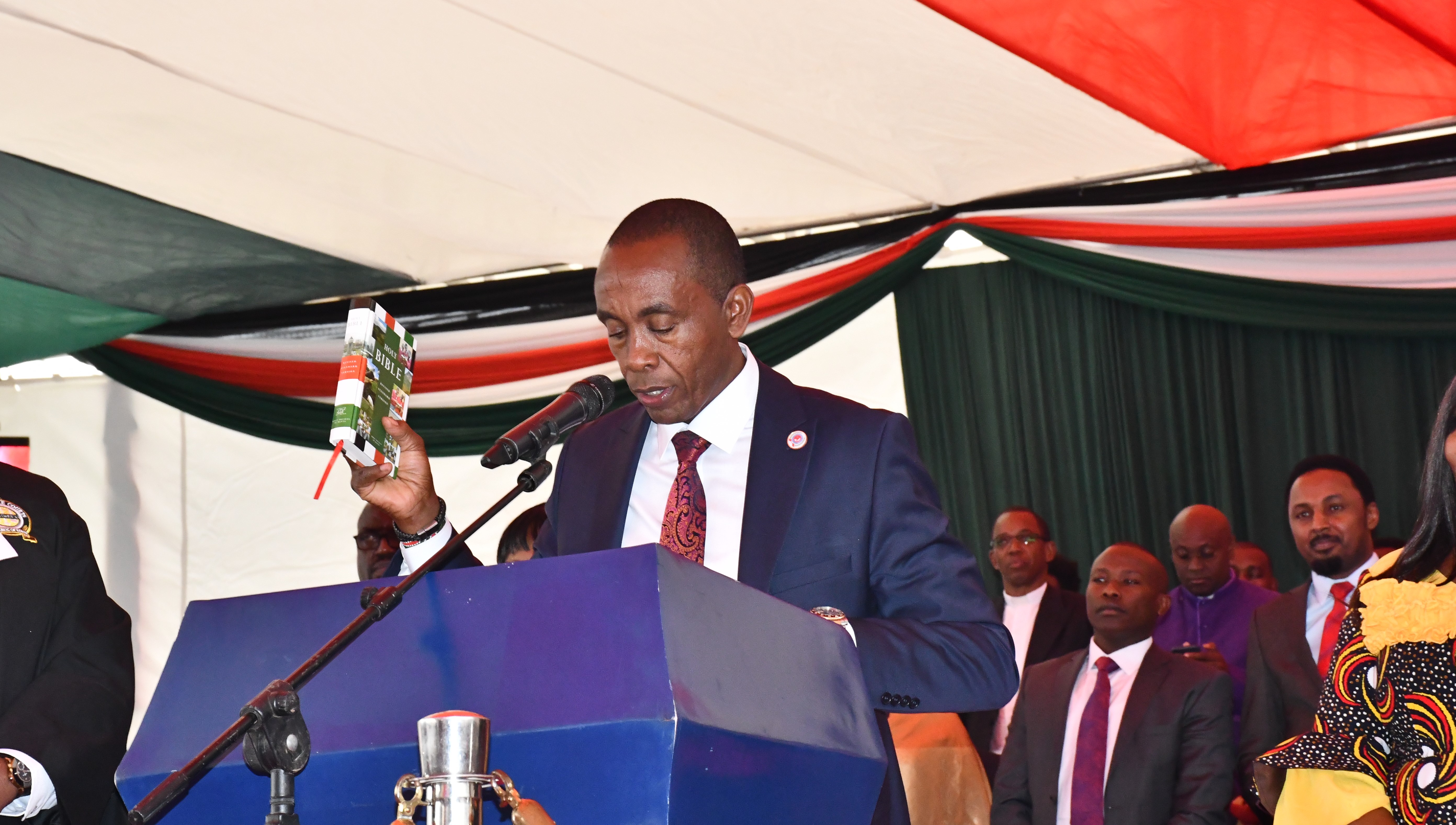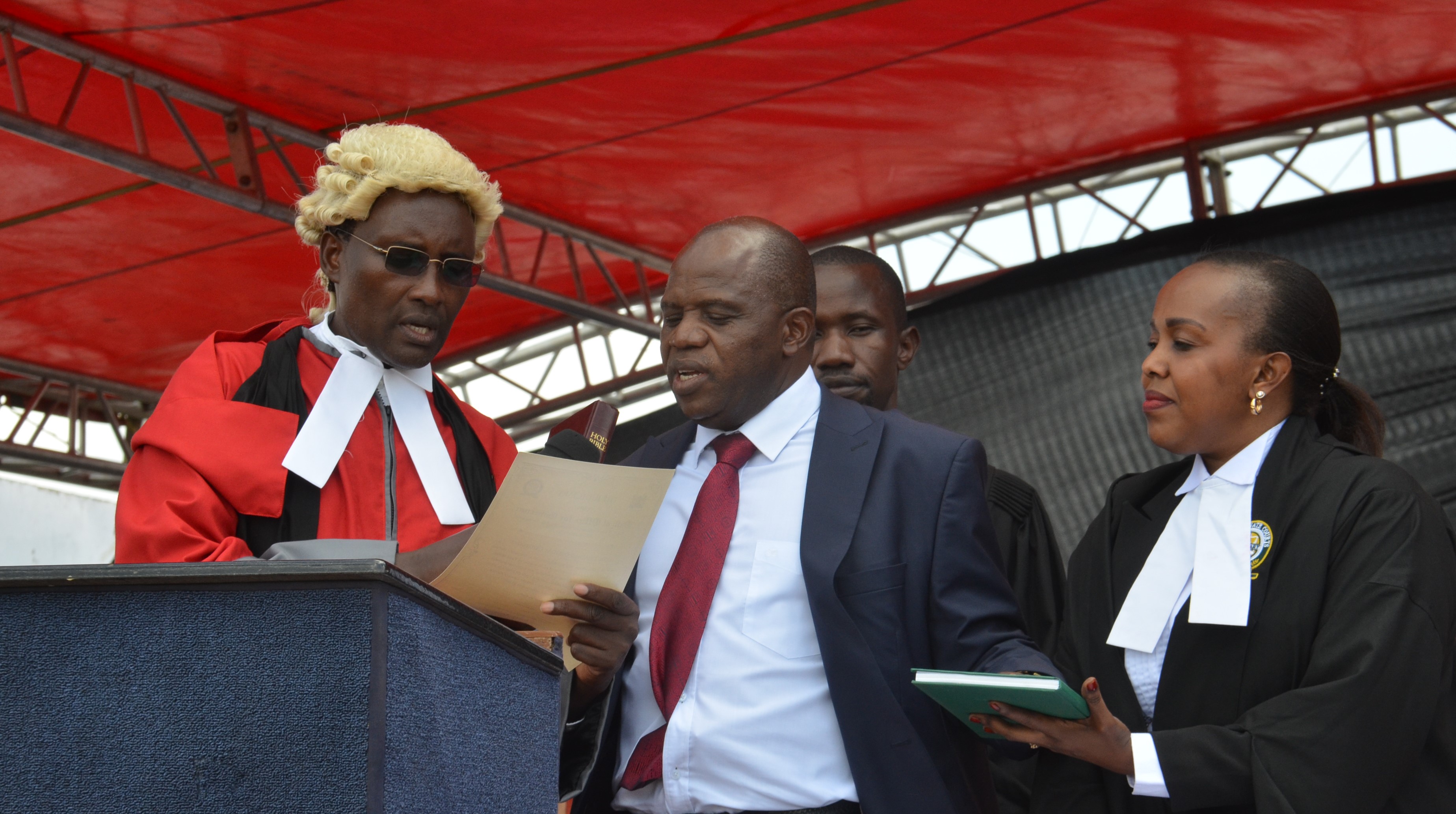 Read onTana River Governor Dhadho Godhana taking oath of office at Hola stadium before high court Judge John Onyiego and Garsen Principal Magistrate Njambi Wasige. By Sadik Hassan