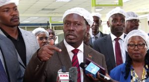Information, Communication and Digital Economy Cabinet Secretary William Kabogo addresses journalists during a visit to monitor the progress of assembling computers by JKUAT students.