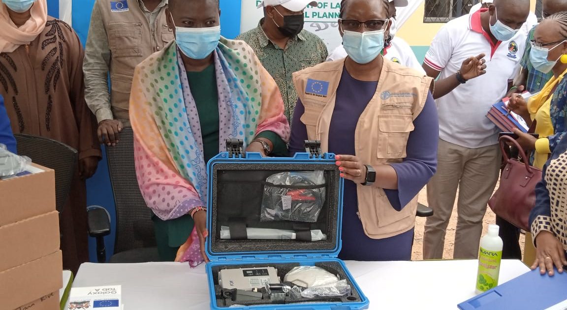 EU Ambassador to Kenya Katrina Hagemann handing over equipment to be used at the Tana River Land registry to CS Karoney.Photo by Sadik Hassan