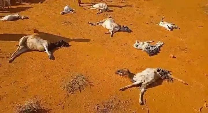 Carcasses of cows, goats and sheep are scattered across open grazing fields and rangelands, highlighting the extent of livestock deaths caused by prolonged pasture and water shortages.