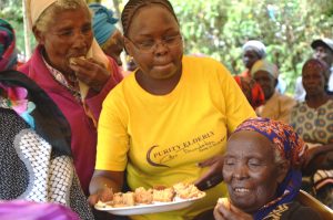 Purity Elderly Care Foundation Director, Joyce Kairu, serving elderly persons cakes during the end of year party held in their honor Monday.
