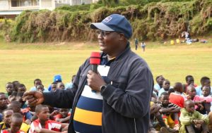 Elgeyo Marakwet FKF branch chair Boaz Kaino addressing under-15 players at the Iten sports ground. Photo by Alice Wanjiru