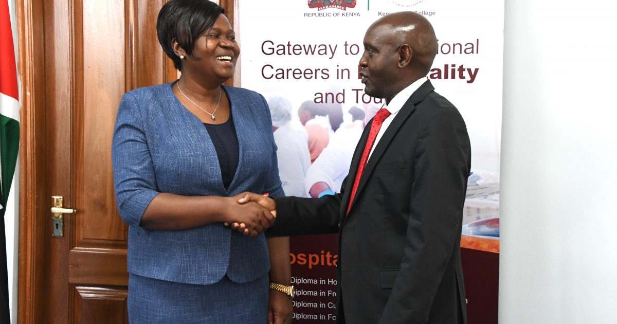 Homa Bay County Governor, Gladys Wanga (L), shakes hand with the Principal Secretary, State Department for Tourism, John Ololtuaa, at the Tourism Fund Building Nairobi, on January 24, 2024. The Governor visited the PS to discuss the coming conference which will be held in Homa Bay County from 27th to 29th February, to promote tourism in the whole western region.