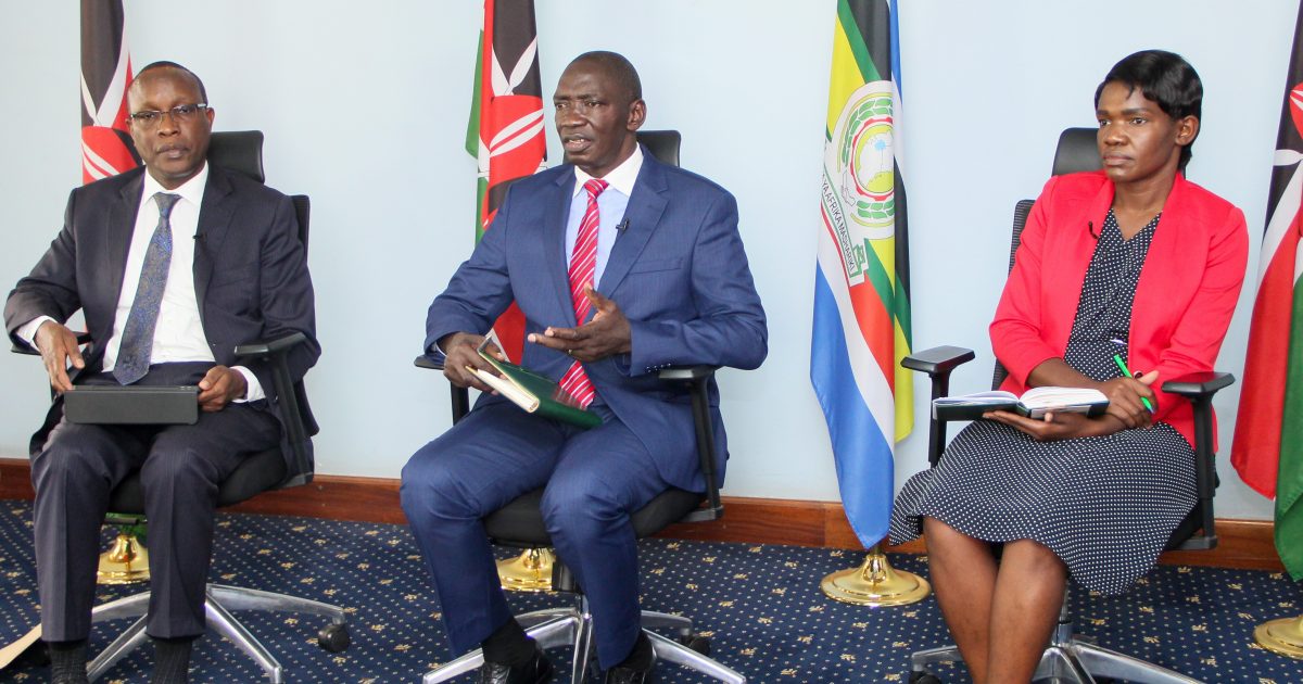 Government Spokesperson, Col (rtd) Cyrus Oguna (Second Right), flanked by Mr. Eric Korir, Director of Public Procurement, National Treasury and Planning (Right) and Ms. Ruth Randa, Manager Marketing, Research and Communications, Women Enterprise Fund (Left) during the Sema Na Spox weekly zoom meeting at the Government Media Centre, Teleposta Towers Monday 20th June 2022.