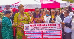 Murang’a County Woman rep Betty Maina, Maragua MP Mary Wamaua and Kimorori ward MCA wa-Risper issue cheques, during the empowerment forum at Kangangu ground in Kimorori ward