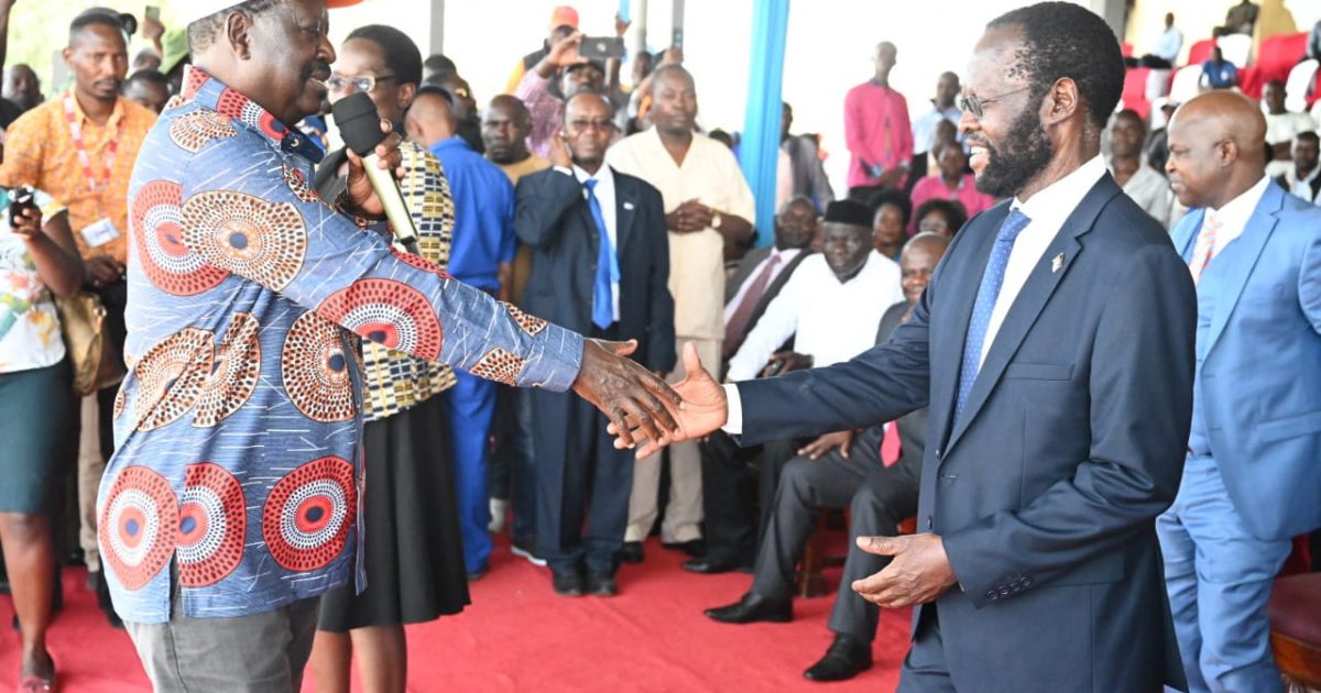 Azimio leader, Raila Odinga congratulates Kisumu Governor Prof. Anyang Nyong’o soon after he was sworn in by Justice William Musyoka at Jomo Kenyatta Stadium today.