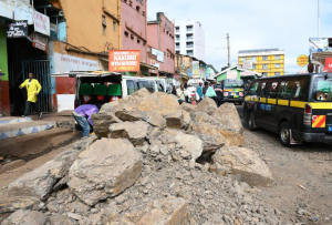 Some of the blocks of rocks used to block the entrances to the three termini located within the Nyeri Central Business District as a standoff between the operators and the county government over a plan to relocate all transport operations to a new terminus. Photos by Wangari Mwangi.