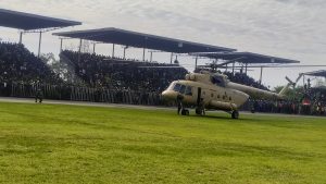 The military chopper ferrying the remains of the former Prime Minister touched down at 8:45 am, bringing activities in the lakeside city to a standstill.